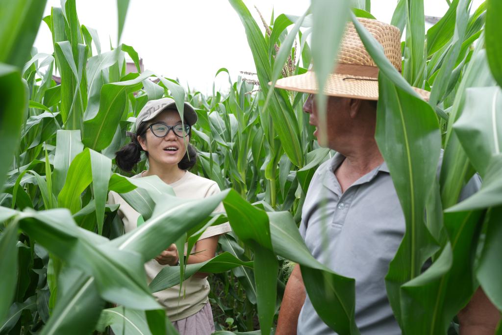 7月17日,在椒江区下陈街道横河陈村,青年创业者陈艳(左)在她开设的观光农场内和本地农民讨论庄稼长势。