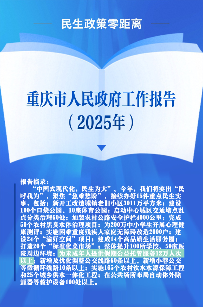 今年重庆市“两会”上,“为未成年人提供假期公益托管”首次作为全市15件民生实事写入政府工作报告,借助“公益+教育”的模式,让孩子们假期有去处、家长放心又省心。