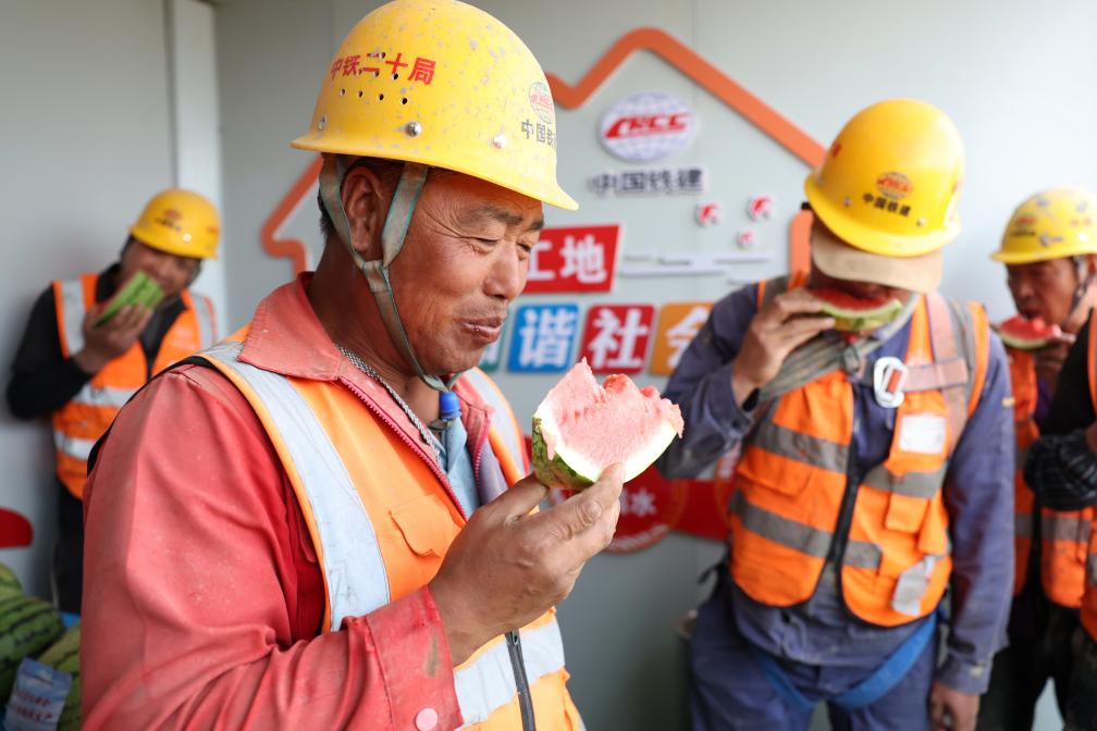 7月23日,在甘肃省武威市古浪县的中铁二十局一处项目工地上,一线劳动者利用工作间隙在“休闲清凉驿站”里吃西瓜。