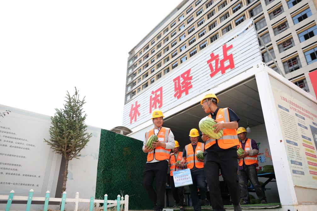 7月23日,在甘肃省武威市古浪县的中铁二十局一处项目工地上,一线劳动者抱着西瓜从“休闲清凉驿站”走出。