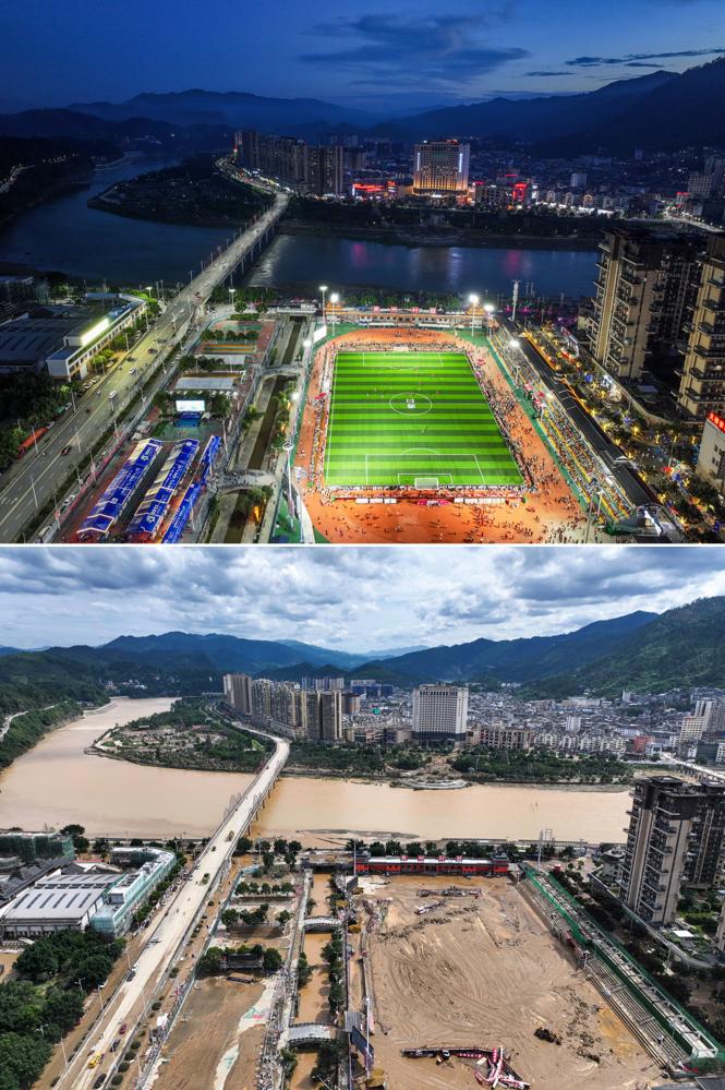 位于县城核心区的“村超”足球场,也两次被洪水淹没,蒙上了一层土黄色。洪水退去,球场一片狼藉。