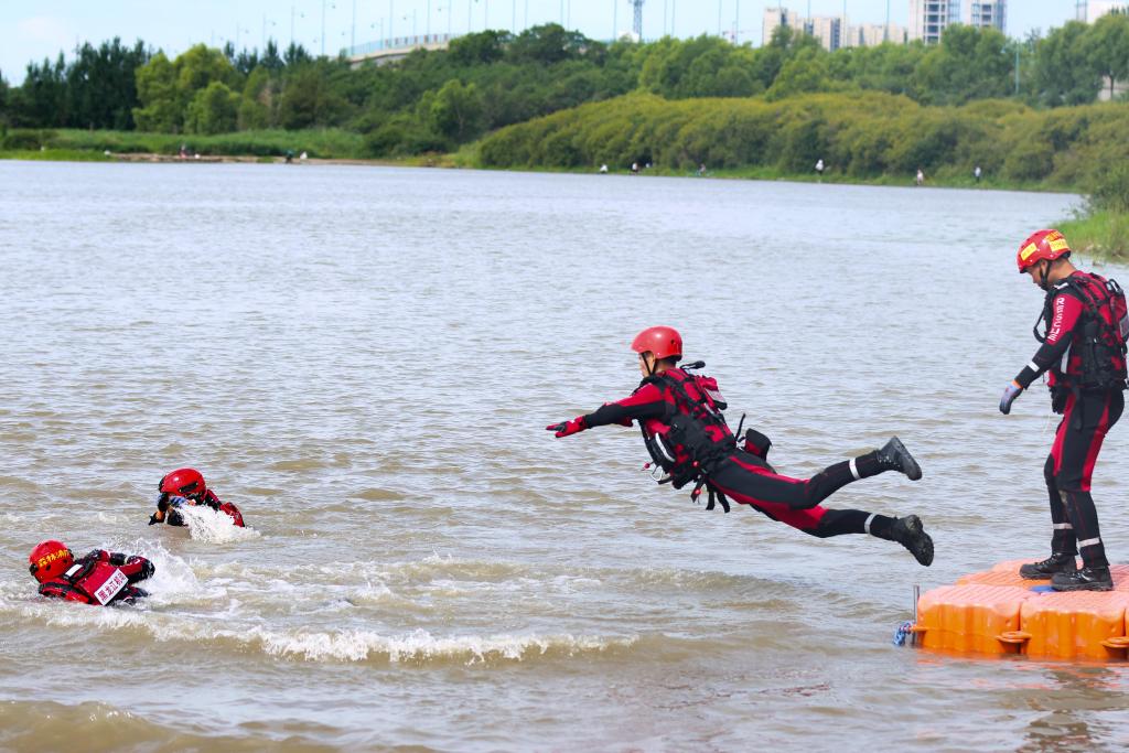 8月5日,参演消防员在松花江哈尔滨段进行入水演练。