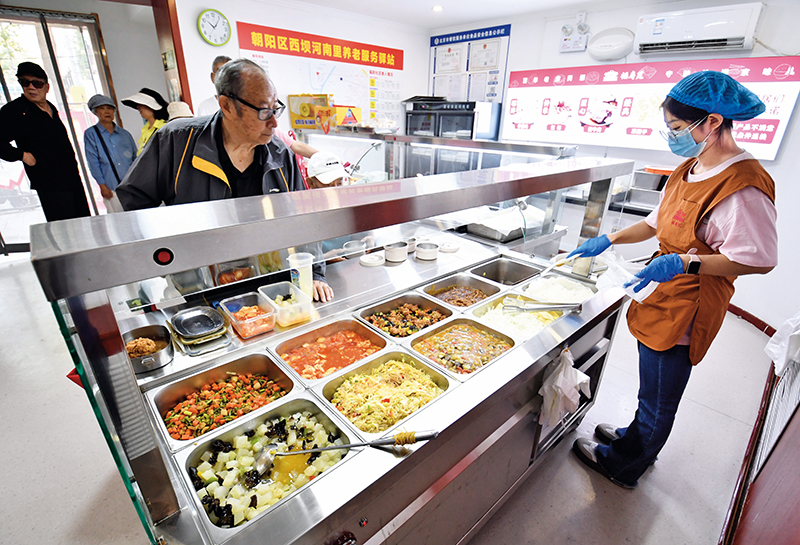 在北京市丰台区青塔街道秀园社区第一养老服务驿站的老年助餐点,刘女士往托盘里夹了三四块红烧肉、焖猪肘和炖牛腩,又把芹菜香干、油焖茄子、炒蘑菇等素菜依样儿拣了点,最后盛了一份米饭。
