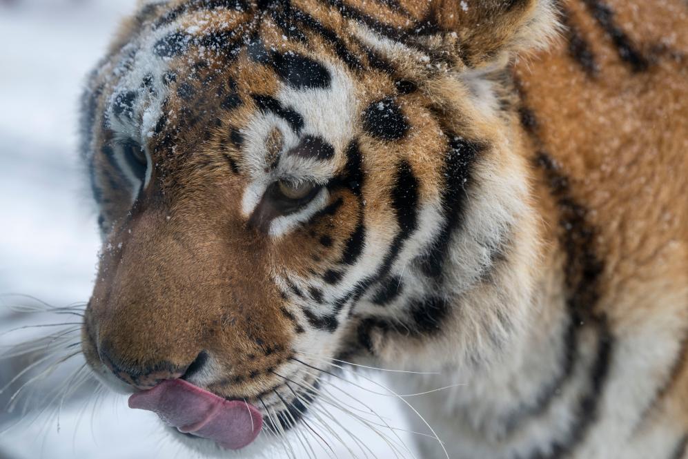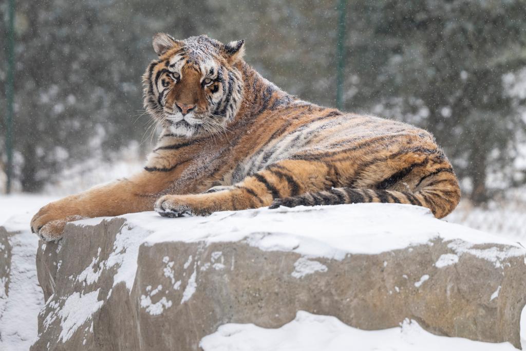 1月12日,冰城哈尔滨市迎来降雪天气,在黑龙江东北虎林园,散放区的东北虎在雪地活动。