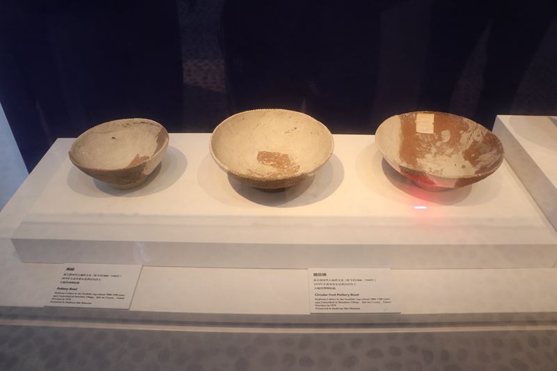 大地湾遗址出土的陶碗和圆足碗(距今约7800-7300年)。新华网发(新甘肃·每日甘肃网记者 郭林玉 摄)