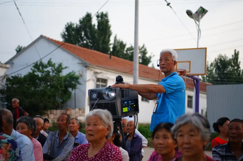 “中国好人”都振明为乡亲们放映电影。新华网发(安丘市电影公司 曹志军摄)
