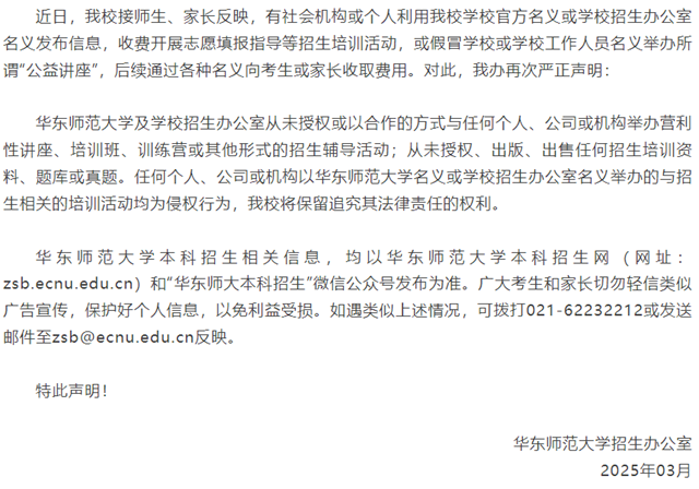 近期,部分社会机构及个人公然以高校名义,发布一系列不实信息,包括收费开展志愿填报指导、举办盈利性培训,甚至宣称能够提供“特殊录取名额”。此类虚假信息不仅误导考生及家长,更严重扰乱了高校招生的正常秩序。