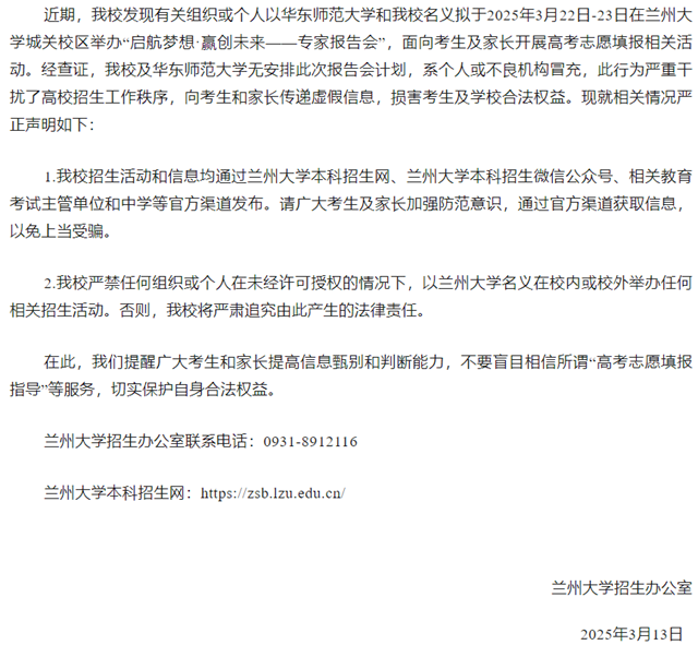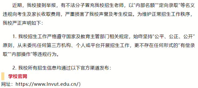 多所高校通过官方渠道发表声明,郑重提醒广大考生及家长务必保持高度警惕,增强防范意识,切勿轻信这些虚假宣传,谨防陷入诈骗陷阱,切实维护自身的合法权益。相关声明一起看——