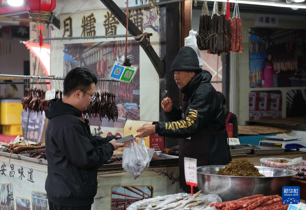 3月29日,游客在安昌古镇的街市上购买腊味食品。
