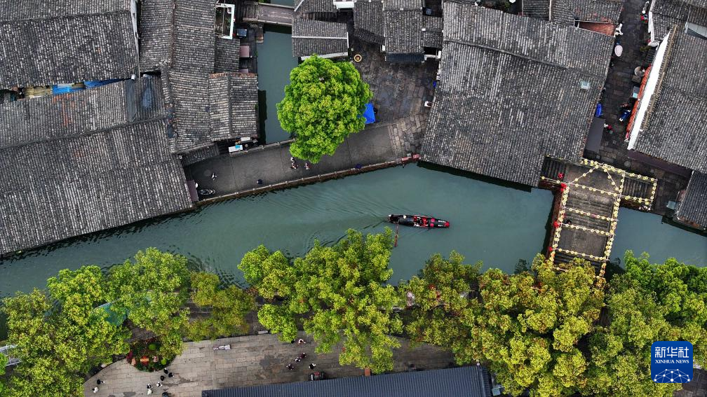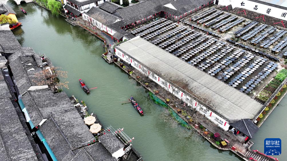 3月29日,乌篷船行驶在安昌古镇的河道上(无人机照片)。