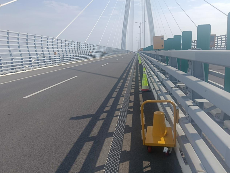 在舟山项目部管辖的86.85公里路段内,跨海桥梁占比显著。当进行单车道封闭作业时,封道人员需横穿高速实施交通锥布设。传统作业模式下,需两名封道人员分别肩扛四个交通锥,往返穿越车流密集区域至中央分隔带,完成临时上游过渡区设置,存在极高的安全风险。此次项目部创新引入小推车单兵横穿作业模式,由养护人员单人推着装载八个交通锥的小推车,严格遵循安全规程,在封闭车道内即可高效完成布设任务。该模式相较传统工艺,不仅实现人工成本减半,更通过减少人员横穿高速频次,显著降低作业人员在车流中的暴露风险,从源头上杜绝因注意力分散、车辆避让不及等导致的伤亡事故,为一线作业人员筑起坚实的安全防线。
