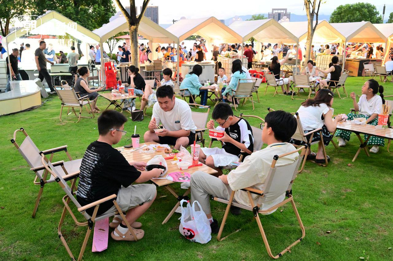 与之相邻的音乐市集更是烟火气升腾:烤架上滋滋作响的肉串香气扑鼻,手捧冰饮或醇香咖啡的人们围坐畅谈,孩子的欢笑、朋友的碰杯声、摊主的热情吆喝,与远处飘来的歌声奇妙交织,共同绘就一幅活力四射、其乐融融的金华夏夜生活图景。