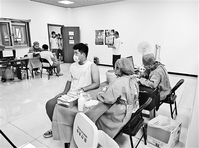7月20日,北京市全面启动12至17岁人群新冠疫苗接种。昨天,北京青年报记者来到门头沟区的接种点,来自首都师范大学附属中学永定分校的中学生正在有序进行疫苗接种。