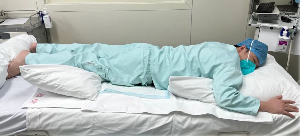 第二步,翻转:在他人的协助下/患者自行翻转至俯卧位。第1个枕头置于患者的胸部或腹部下方,第2个枕头置于患者前额下方,第3个枕头置于脚踝部位。患者头部转向自己认为舒适的位置。