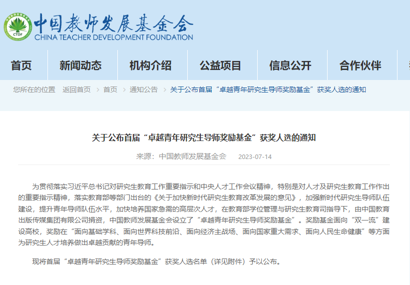 “卓越青年研究生导师奖励基金”由教育部学位管理与研究生教育司指导,中国教师发展基金会设立。奖励基金面向“双一流”建设高校,奖励在“面向基础学科、面向世界科技前沿、面向经济主战场、面向国家重大需求、面向人民生命健康”等方面为研究生人才培养做出卓越贡献的45周岁以下青年导师。该基金每年组织一次,每次遴选约20名卓越青年研究生导师,2023年为首届评选。