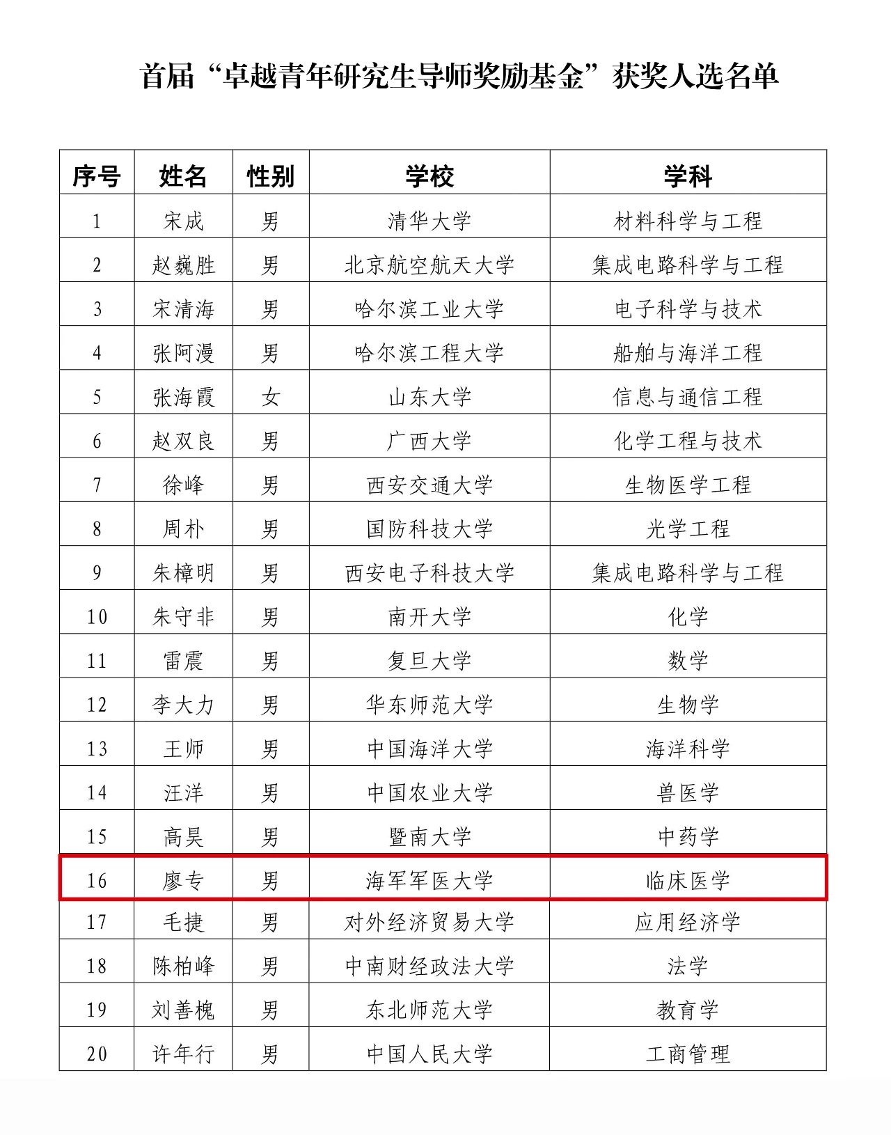 近日,中国教师发展基金会发布《关于公布首届“卓越青年研究生导师奖励基金”获奖人选的通知》,全国共20所“双一流”高校入选。上海长海医院廖专教授凭借在研究生教育领域取得的突出成绩入选该奖项,是全军医学类院校唯一获奖者。
