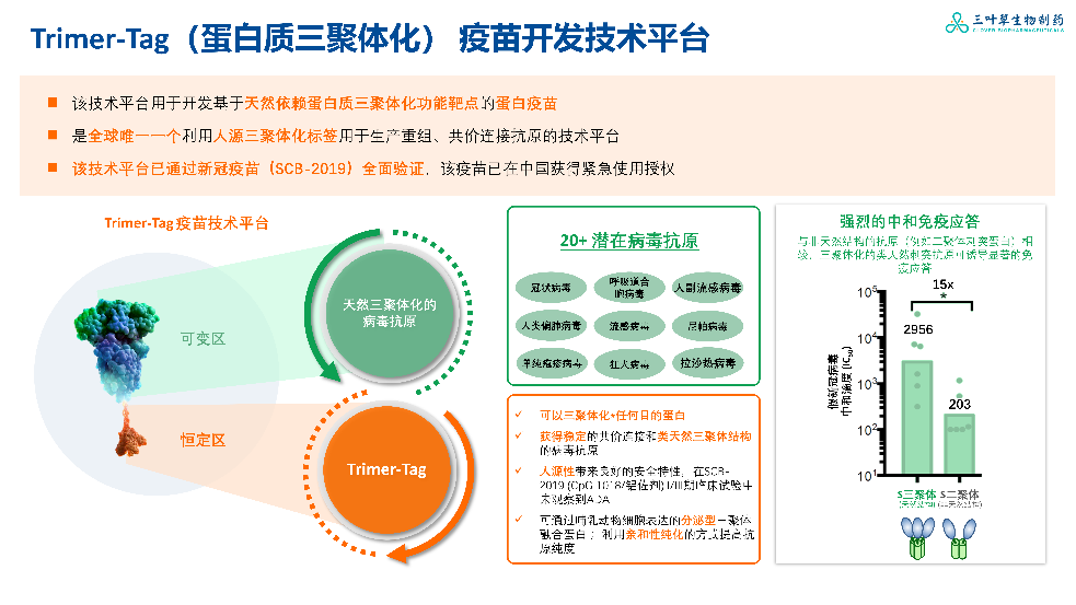 三叶草生物坚持源头创新,拥有独创领先的蛋白质三聚体化(Trimer-Tag)疫苗研发平台,这是全球唯一一个利用人源三聚体化标签用于生产重组、共价连接抗原的技术平台。三叶草生物的技术平台已通过其第一个商业化疫苗产品得到全面验证,该技术平台的适用性还可扩展到其他在研的产品管线。除此之外,三叶草生物拥有已证实的全球疫苗研发实力,研究经验横跨五大洲(八个国家),且其拥有广泛专业背景的全球科学顾问委员会,为创新型自研管线的研发注入活力。