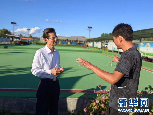 于建伟(左)赴延吉“乐龄之家”调研,与村支书进行工作沟通