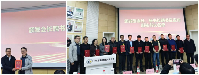 会议上,IFA 营养健康产业分会会长许文涛宣读IFA营养健康产业分会秘书处副秘书长名单为荣冬梅、李相阳和朱龙佼,韩文德、翟百强、郑杰、王宏峰、刘志杰、蒋志刚、于海莲为荣誉副会长,同时为副会长单位授牌。