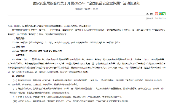 7月30日,国家药监局发布了关于开展 2025年“全国药品安全宣传周”活动的通知,明确将于2025年9月1日至7日举行“全国药品安全宣传周”活动,主题为“药品安全 监管为民”。