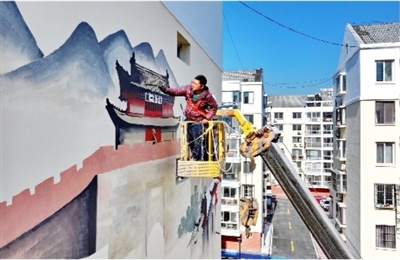 河北省秦皇岛市海港区东环路街道红光北里社区一处小区内,工人正在进行墙体彩绘。 人民图片