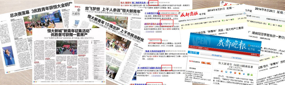 恒大“新青年 新居梦”举行新闻发布会,“三套房奖励新青年”引媒体界哗然。同日,新华网、四川在线等多家网络媒体新闻上线。