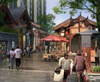 从外观上,整个商业街区分为两个部分,一部分以怀旧式仿古建筑为主,体现中式传统风情。青石铺路,青瓦盖顶,沿街商铺均采用木质结构,名称则做成老式匾额高悬其上,植物主要以黄金竹和攀爬植物为主,街面以古朴壁灯为装饰照明,临街院落将透过橱窗展示其业态精髓。人行走在其间街道,不仅是逛街,更是观景,岁月悠悠,情怀氤氲,小巷古朴深邃,令人陶醉其间。