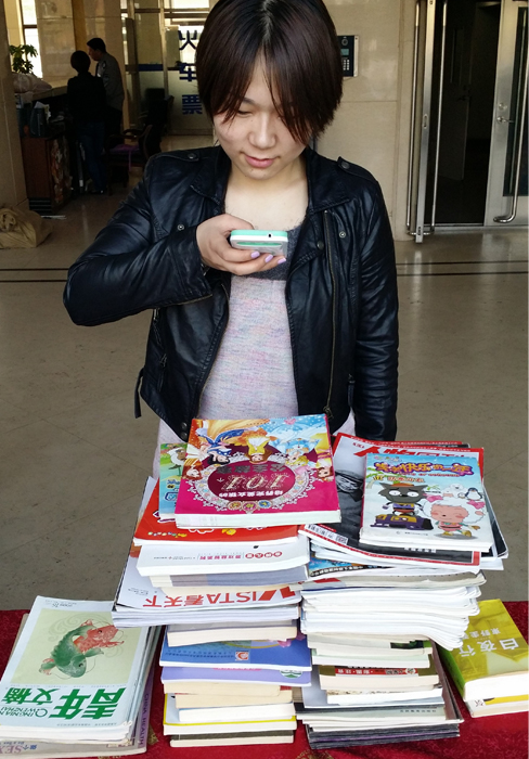 4月17、18日,“图书换绿植”公益活动在继续,写字楼大堂里,献爱心的队伍愈排愈长,在沈阳冠信大厦里,新华网记者发现一位中年女子拿了一口袋精装新书。