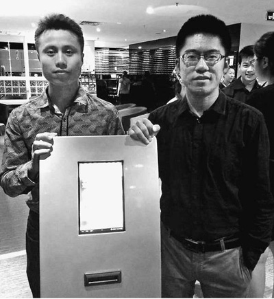 朱保举(右)、黄礼君和他们曾经参与设计的餐馆拿号机。