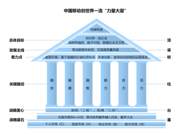 一言一概之,“力量大厦”明确了中国移动的总体目标、发展主线、战略内核和战略基石,提纲挈领地回答了中国移动未来五年甚至更长时间究竟要干什么、怎么干的关键核心问题。