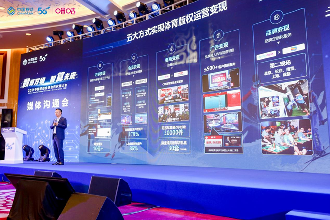 11月1日下午,2021中国移动全球合作伙伴大会媒体沟通会在广州云来斯堡酒店举行,中国移动咪咕公司业务发展事业群EVP朱泓出席并首度发布咪咕公司体育版权运营商业模式,同时分享咪咕公司利用5G等技术能力助推冰雪运动数智化转型的实践经验。
