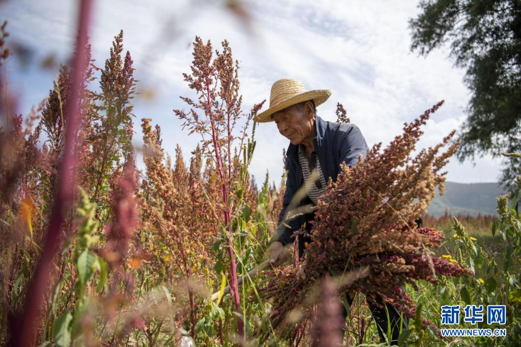 2022年9月,静乐县娘子神乡南舍村,村民在田间收割藜麦(资料图)。新华网 发(杨晨光 摄)
