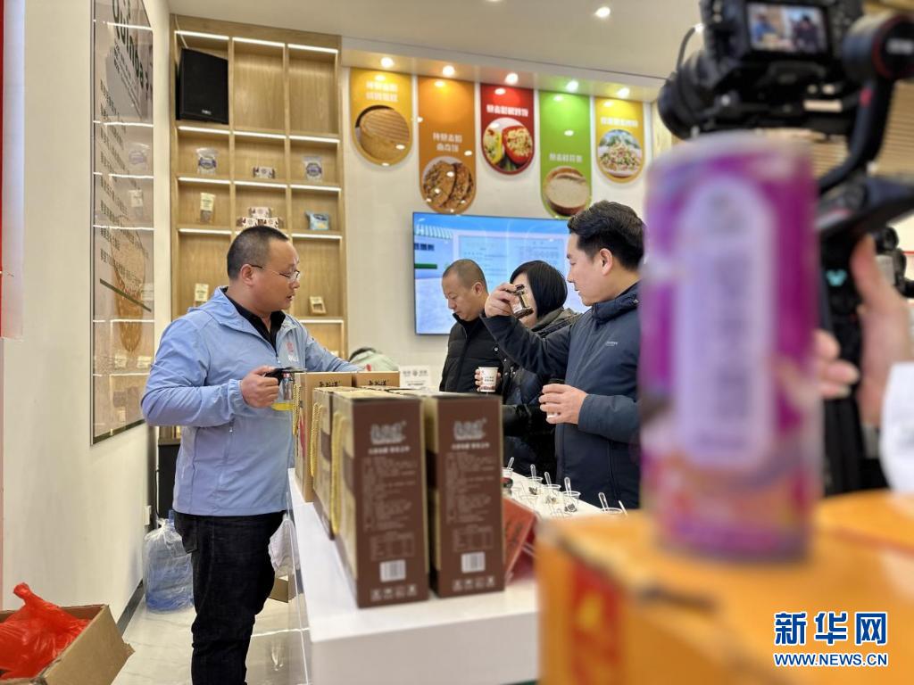 静乐县至远种植专业合作社创始人宋进才正在介绍原味藜麦酱。新华网 发(杨晓飞 摄)