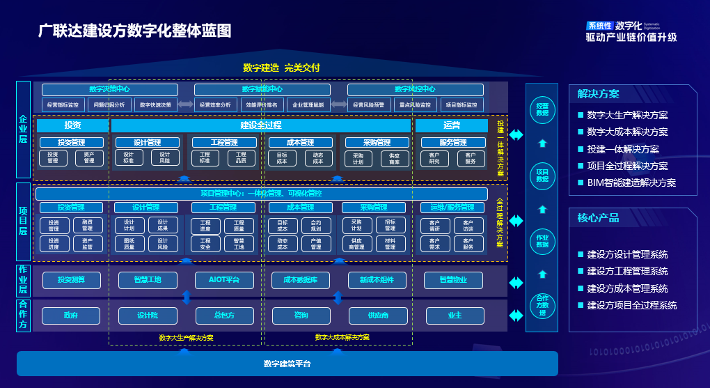 面向房地产开发企业,广联达把在项目层和作业层的数字化能力整合到房地产开发企业已有的数字化体系里面去,为房地产开发企业提供项目精益化管理的能力。这便是我们的大生产的解决方案、大成本的解决方案。