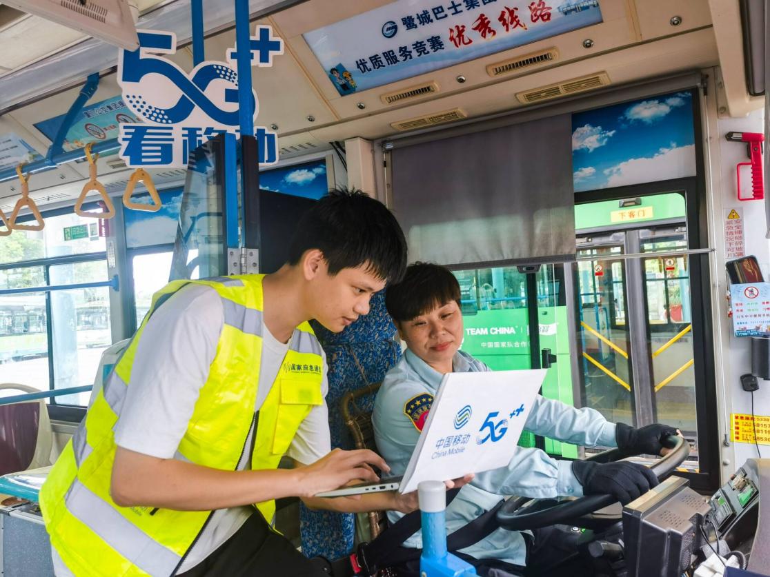 中国移动福建公司技术人员与公交车司机进行操作交流。