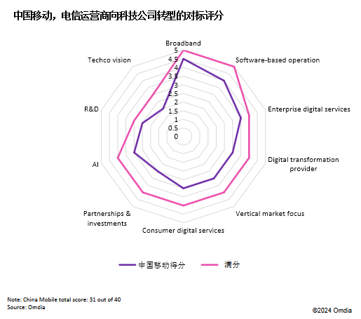 在数字化浪潮席卷全球的今天,数字化转型成为各大企业争相实现的重要任务之一。近日Omdia发布的关于电信运营商向科技公司战略转型的权威报告(以下简称报告),则毫无疑问地吸引了众人关注。中国移动以31的高分(满分40分)荣登榜首,延续了其在2022年和2023年的辉煌成绩,连续三年蝉联第一。