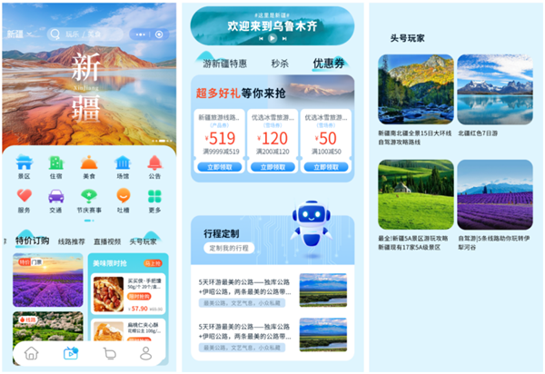 结合年轻人旅游的喜好,新版本还更新了头号玩家、行程定制、特价秒杀、线上抽奖、一键租车等惠民便民功能。新开通的特色场馆服务功能,让千里迢迢来新疆旅游的游客,不再只是单一的游览山水风景,更满足了新疆民俗、文化深度游览需求。
