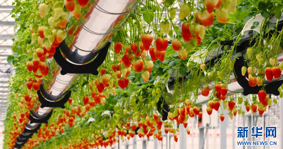 草莓大棚里,工作人员打开手机App点击屏幕,智能化钢质种植管缓缓升起,一颗颗草莓悬吊在半空中,露出红红的“小脑袋”。