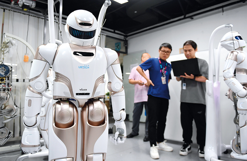 在位于深圳市南山区智园的优必选总部,工作人员对人形机器人进行测试(2024年6月26日摄)   毛思倩摄 / 本刊
