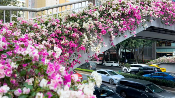 “我们当时试种了三四十种植物,簕杜鹃的试种效果是最好的,耐旱耐高温,下垂效果好,花期也比较长,所以最终应用在了天桥绿化上。”园科院白云苗圃主任温志告诉记者,目前筛选推广了23个簕杜鹃新品种上桥种植,包括小叶紫、水红、花蝴蝶、巴西紫、玫瑰红、柠檬黄、金心双色、加州黄金、樱花、重苞大红等。