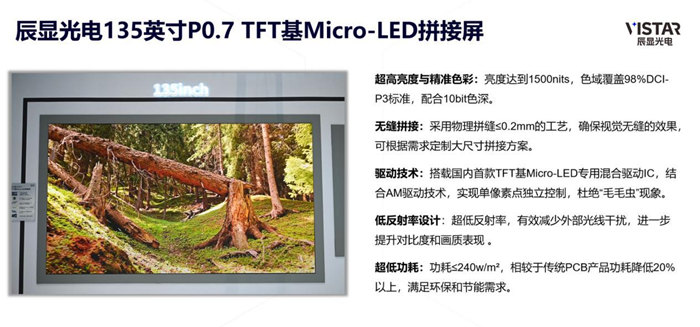 辰显光电深耕TFT基Micro-LED技术,聚焦即将量产的P0.7 TFT基Micro-LED产品,在混bin算法、混合驱动、共阴极高压芯片、微纳覆膜技术等方面实现了突破,使产品具备了超高亮度、精准色彩、冷屏低功耗、低反射率等特点。
