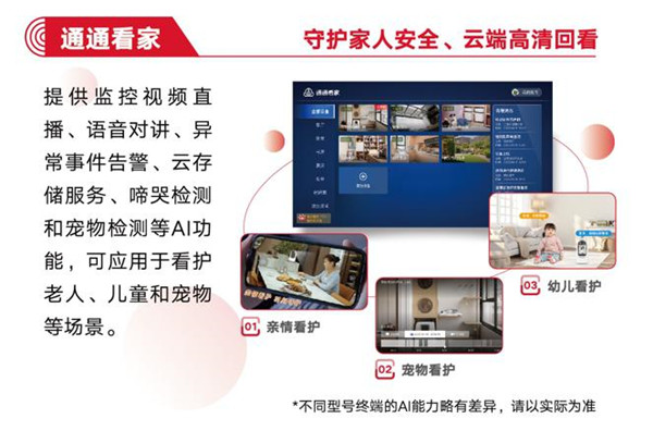 在儿童教育方面,它不仅对接“国家中小学智慧教育平台”,可以语音唤出课程资料,还支持边看边问;在年轻人娱乐方面,智家通通搭载强劲内置算力,无需 PS5 等高阶硬件,就能让用户实现秒速加载畅玩3A大作;在中老年健康方面,智家通通拥有庞大的内容库,健身、舞蹈课程一应俱全,它还可以通过AI捕捉用户动作姿态,给用户提供调整建议;在家庭安全方面,智家通通可以联动摄像头、门铃等设备,实现远程看家、异常告警、亲情视频等功能。