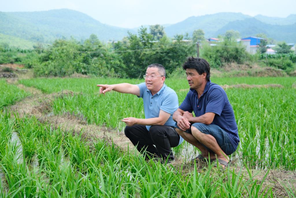 盛夏时节,嫩绿的稻苗在一碧如洗的天空下摇曳,阡陌小径贯穿稻田,形成一幅如诗如画的耕种画卷。广西壮族自治区全州县东山瑶族乡白竹村村民唐增亮拨开稻苗,一旁的驻村第一书记莫日发叮嘱道:“今年也要记得使用农家肥,高残留农药可过不了检。”