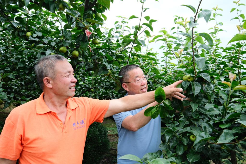 莫日发(右)在梨园检查梨子长势。新华社记者 邹雨沁 摄