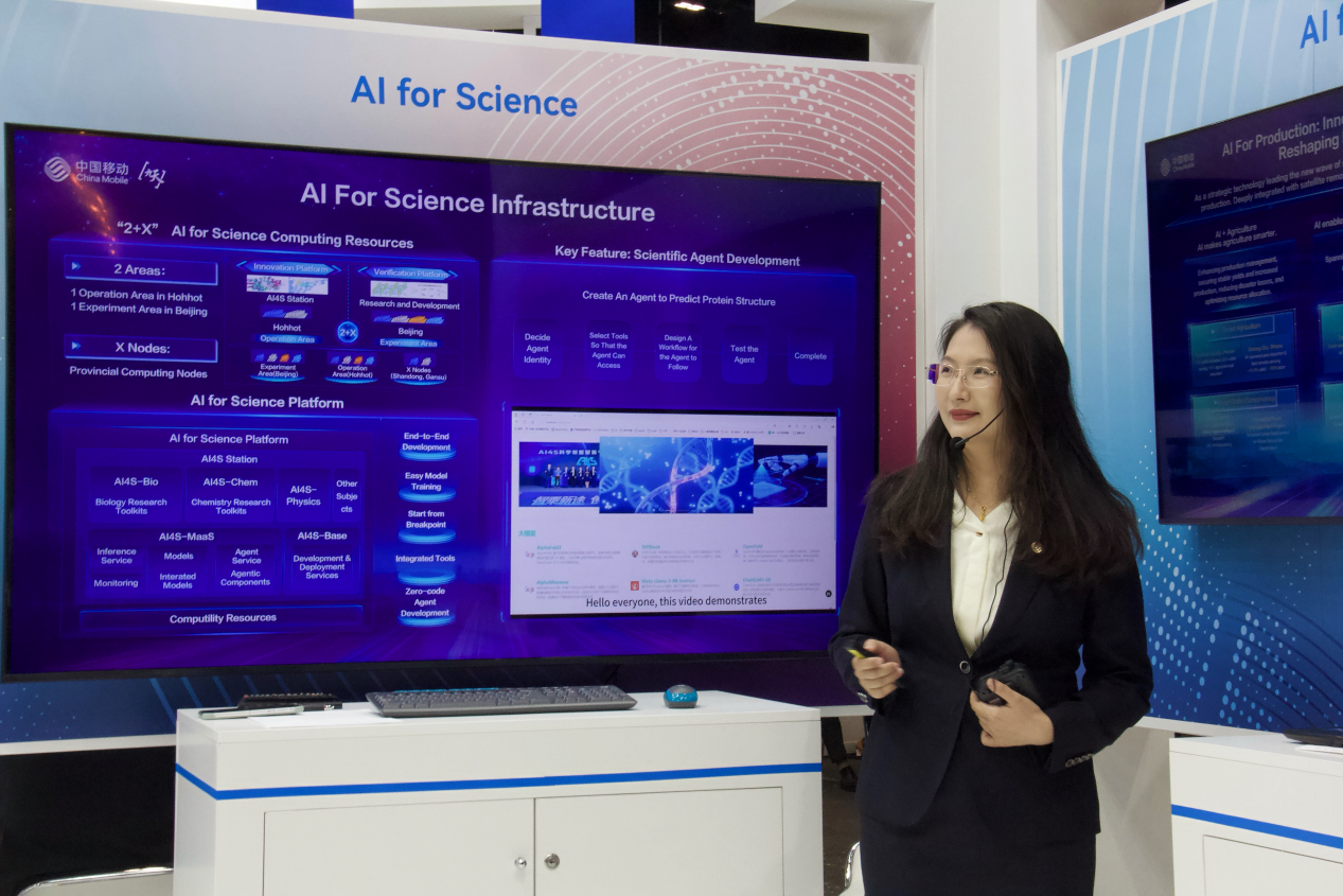 展区一侧,AI4S科学试验装置的展示吸引了观众的目光。作为中国移动推动人工智能与科学研究深度融合的一大创新成果,该平台集成了30个预训练模型和超7TB多学科数据集,打通从材料分子筛选、设计,到物质合成与试验标准制定的全自动化流程。