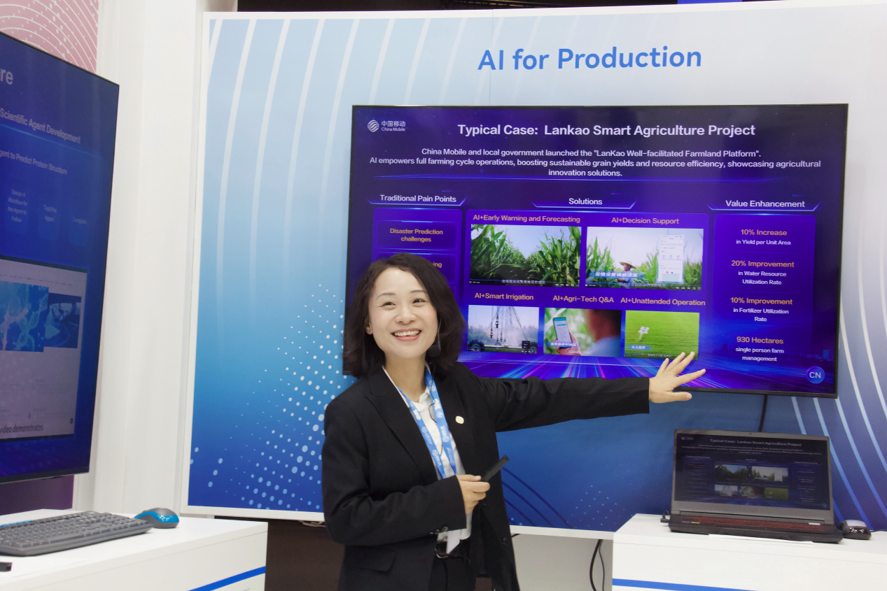 在农业现代化进程中,水利建设与农业生产相辅相成。现场还给大家展示了中国移动在宁夏贺兰山创新打造的防洪“四预”工程,通过构建水利大模型,显著提升智慧水利“预报、预警、预演、预案”四预体系数字化、网络化、智能化水平。这一系列解决方案不仅展现了中国移动AI能力在助力农业生产管理、农田稳产增产、赋能智能决策河湖治理等方面的创新实践,更通过科技赋能粮食安全与生态保护,为全球农业可持续发展贡献了“中国方案”。