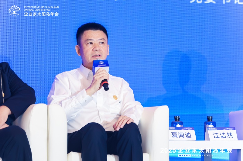 图为中国机械国际合作股份有限公司党委书记、董事长夏闻迪在2025企业家太阳岛年会主论坛思客对话环节进行发言。