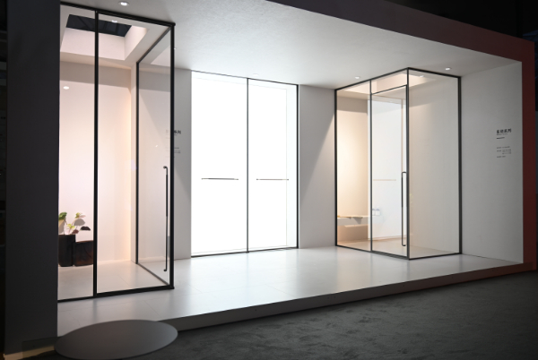 灵犀系列全景门完成家用到商用场景升级,T字型结构搭配12mm超白钢化玻璃,实现视野通透化;顶部隐藏式LED灯带可调节办公氛围,智能门禁系统、电动开合装置支持"开放办公/私密洽谈"模式一键切换,满足现代商业空间智能化需求,被业界称为"移动CBD隔断方案"。