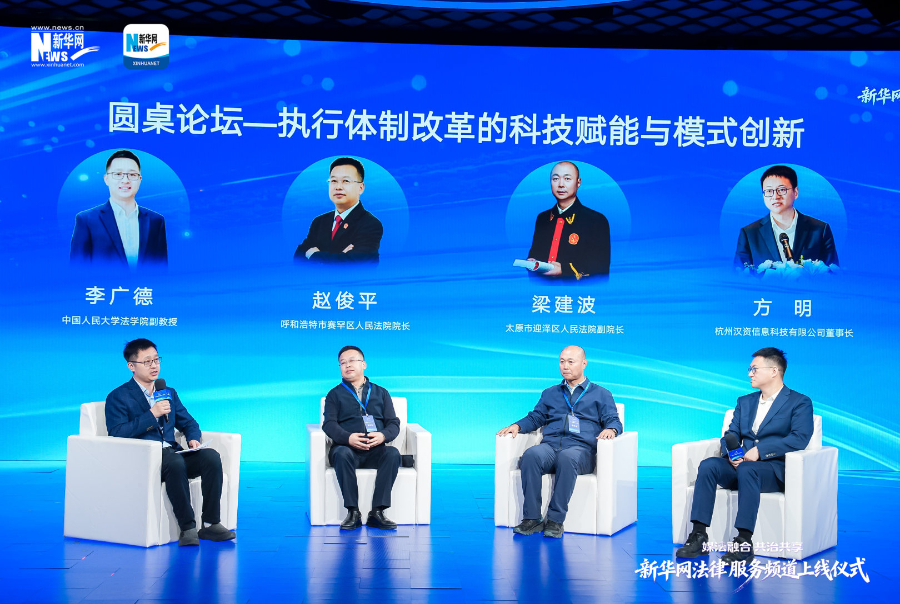 新华网北京4月22日电(陈静)凝聚行业智慧,共探发展路径。4月22日,一场聚焦《执行体制改革的科技赋能与模式创新》的圆桌论坛在新华网法律服务频道上线仪式现场举行。中国人民大学法学院副教授李广德担任主持人,呼和浩特市赛罕区人民法院院长赵俊平、太原市迎泽区人民法院副院长梁建波、杭州汉资信息科技有限公司(以下简称“汉资科技”)董事长方明作为嘉宾齐聚一堂,共同探讨科技赋能与模式创新如何为执行体制改革注入新动力。