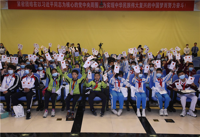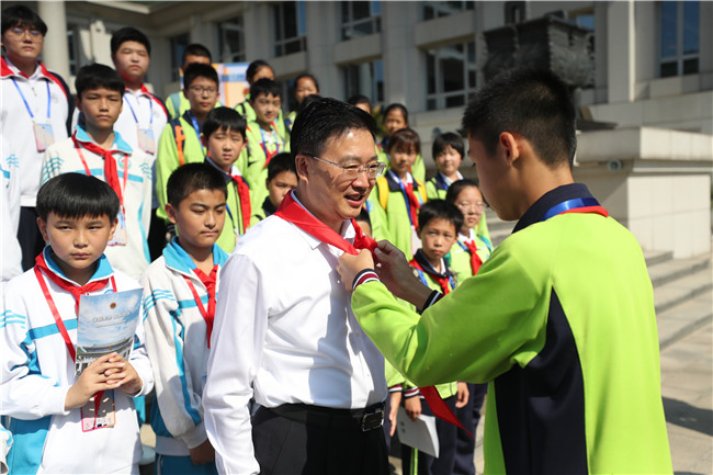 上午8:45分,最高检党组书记、检察长张军和党组副书记、常务副检察长童建明来到学生中间,热情地和大家打招呼。北京教育学院附属丰台实验学校的学生分别为两位“大朋友”系上红领巾。